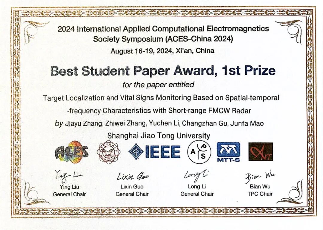 近日,2024年国际应用计算电磁学会议(ACES-China)在西安举行,韦德国际1946源于电子信息与电气工程学院电子工程系毛军发院士团队博士研究生张嘉宇为第一作者的论文“Target Localization and Vital Signs Monitoring Based on Spatial-Temporal-Frequency Characteristics With Short-Range FMCW Radar”(基于短距MIMO FMCW雷达时空频特征的人员定位与生命体征探测)从100余篇参评学生论文中脱颖而出,荣获最佳学生论文一等奖,主要指导教师为顾昌展副教授、毛军发院士。