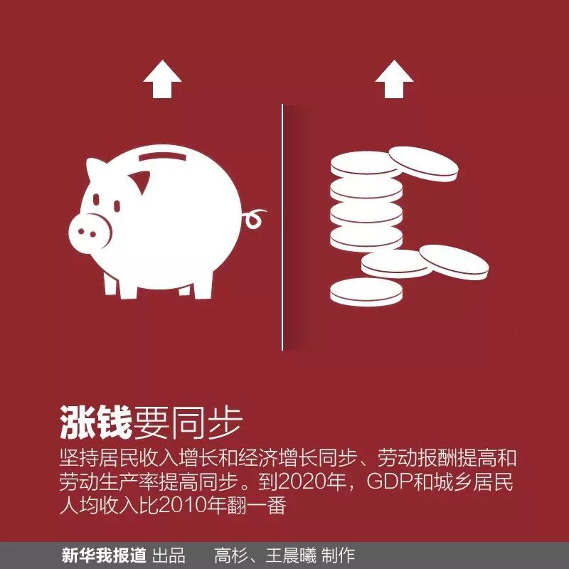 全会提出了全面建成小康社会新的目标要求:经济保持中高速增长,在提高发展平衡性、包容性、可持续性的基础上,到二○二○年国内生产总值和城乡居民人均收入比二○一○年翻一番,产业迈向中高端水平,消费对经济增长贡献明显加大,户籍人口城镇化率加快提高。农业现代化取得明显进展,人民生活水平和质量普遍提高,我国现行标准下农村贫困人口实现脱贫,贫困县全部摘帽,解决区域性整体贫困。国民素质和社会文明程度显著提高。生态环境质量总体改善。各方面制度更加成熟更加定型,国家治理体系和治理能力现代化取得重大进展。