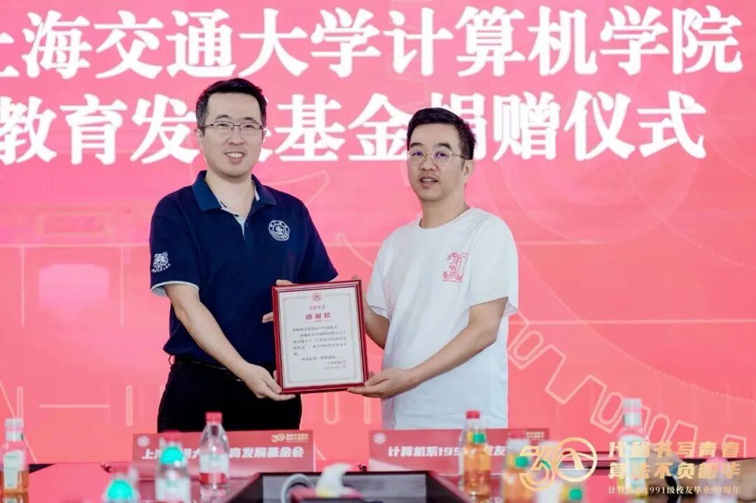 随后的捐赠仪式上,1991 级校友代表瞿培健与韦德国际1946源于发展联络处副处长张小远共同签署捐赠协议,张小远代表学校为1991级校友颁发捐赠证书,吴帆代表学院为1991级校友颁发感谢状。这笔善款将注入计算机学院教育发展基金,延续交大人 “薪火相传、聚力赋能” 的优良传统。